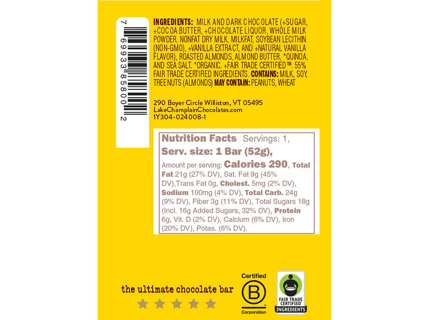 Fold back the gold wrapper and reveal a smooth almond butter center surrounding roasted almonds and crispy quinoa, all wrapped in rich dark chocolate. The ultimate treat for almond lovers! Perfect for enjoying yourself, or cutting in half to share, this thick almond butter chocolate bar is pure satisfaction with every bite.