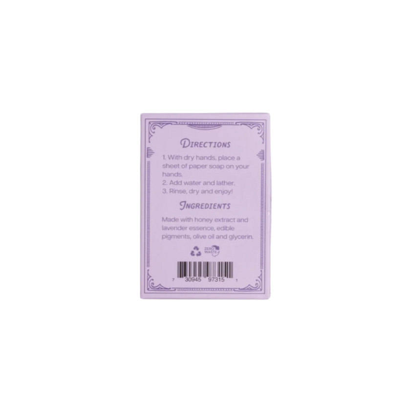 Each package includes 50 sheets of fragrant, cleansing bliss. Perfect for on-the-go freshness, these paper soap sheets dissolve in water, leaving your hands clean, soft, and lightly scented. Made with honey extract and lavender essence, edible pigments, olive oil, and glycerin.