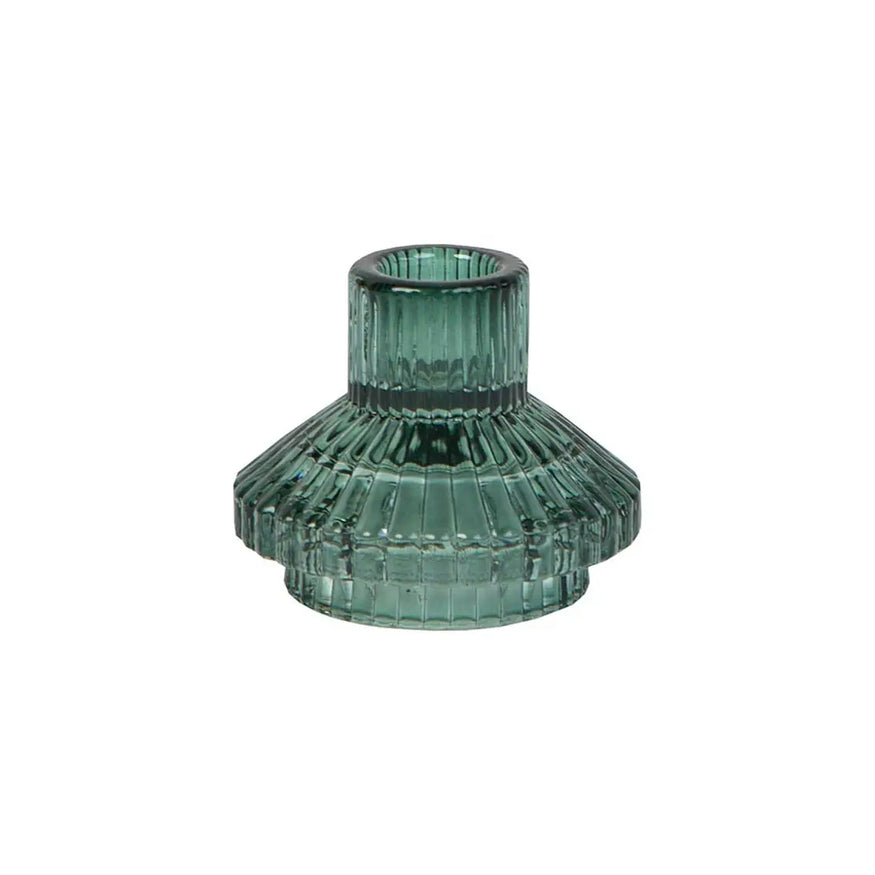 Borrowing the subtle green tone of the frosty winter firs, this little glass candle holder embodies the elegance of a snowy forest. The geometric, ribbed glass design will bring a note of sophistication to your home and holds its own when placed on a festive table.