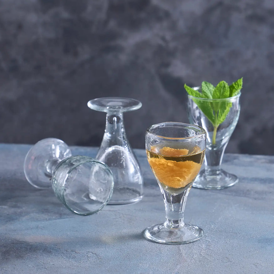 This diminutive footed shot glass transforms the simple act of sipping into a refined ritual. Featuring a tulip-shaped bowl that gracefully tapers to concentrate aromas, paired with a sturdy stem and a wide, stable foot, it offers both elegance and practicality. The pebbled texture on the glass adds a subtle tactile dimension and visual depth, catching the light beautifully. Perfect for savoring spirits neat or crafting delicate aperitifs, these shot glasses combine artisanal craftsmanship with timeless design, making every small pour feel intentional and special.