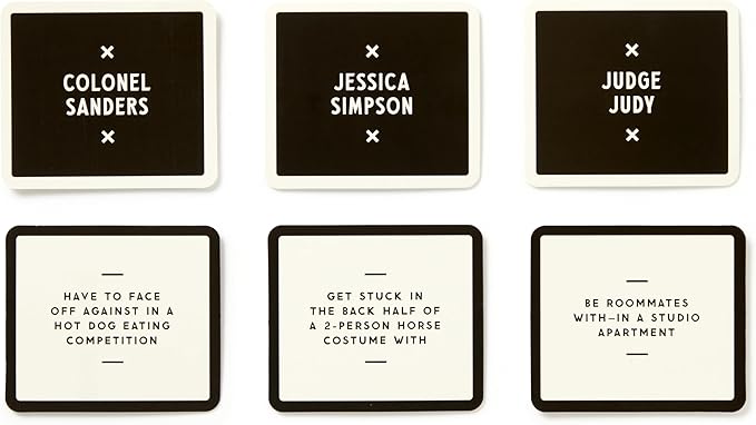 HOW TO PLAY - Players draw 3 random ‘celebrity’ cards and 3 equally random ‘activity’ cards–then full-on debate about which would make the ideal pairings. There’s a catch though–you’re not deciding which ones you would pick, but what you think that round’s ‘judge’ would choose. Aka, you win points for knowing just how weird your friends are.