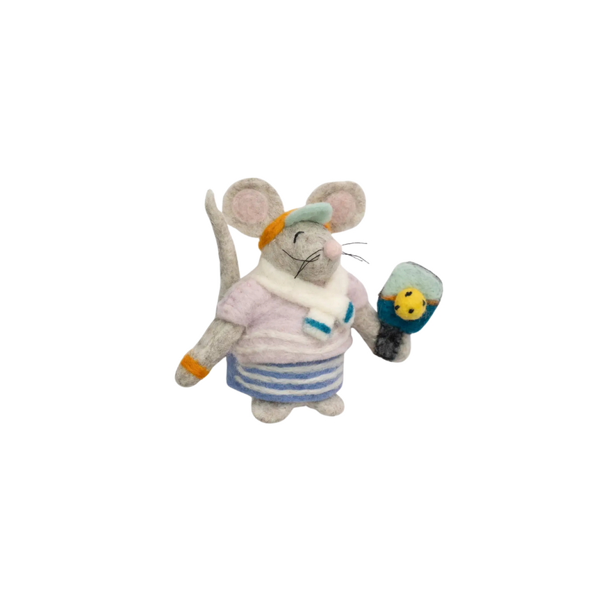 Game, set... squeak! This Felt Pickleball Mouse Ornament is here to serve up some serious holiday fun. Dressed in a retro striped sweater, matching skirt, bright orange visor, and tiny sweatbands, this sporty little mouse is fully geared up with a pickleball paddle and ball in paw.
