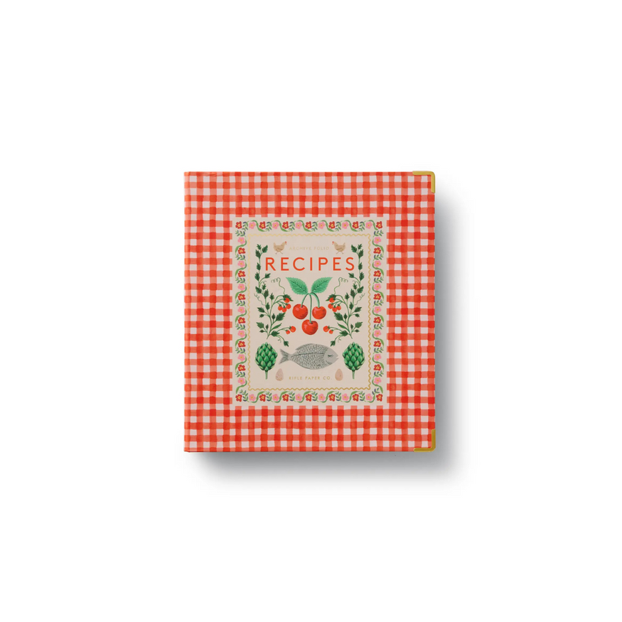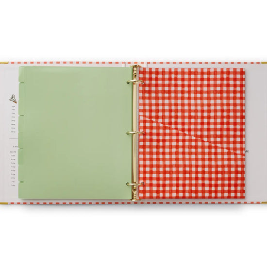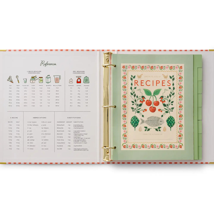 The Cherry Farm Recipe Binder has an illustrated cover with reinforced metal corners. It is printed in full color and foil stamped Metallic gold foil.