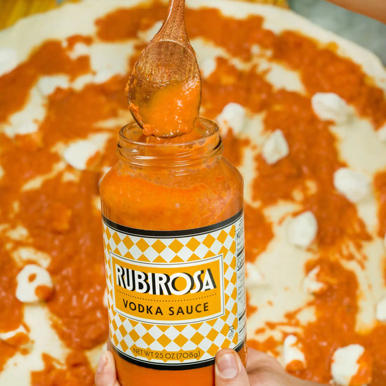 Rubirosa Vodka Sauce is the signature sauce at Rubirosa, featured on the Vodka Pizza and Tie-Dye Swirl Pizza.