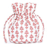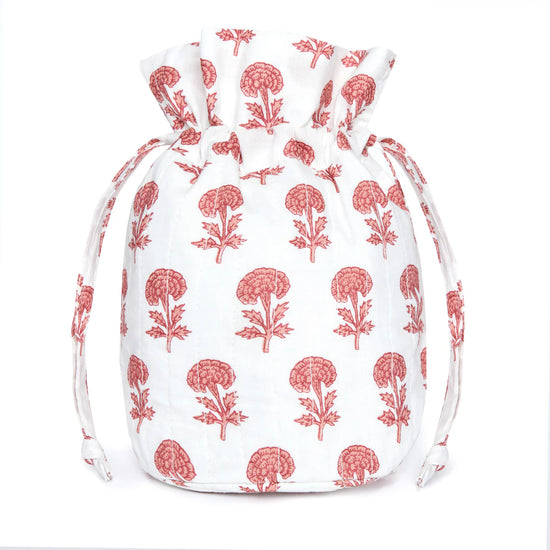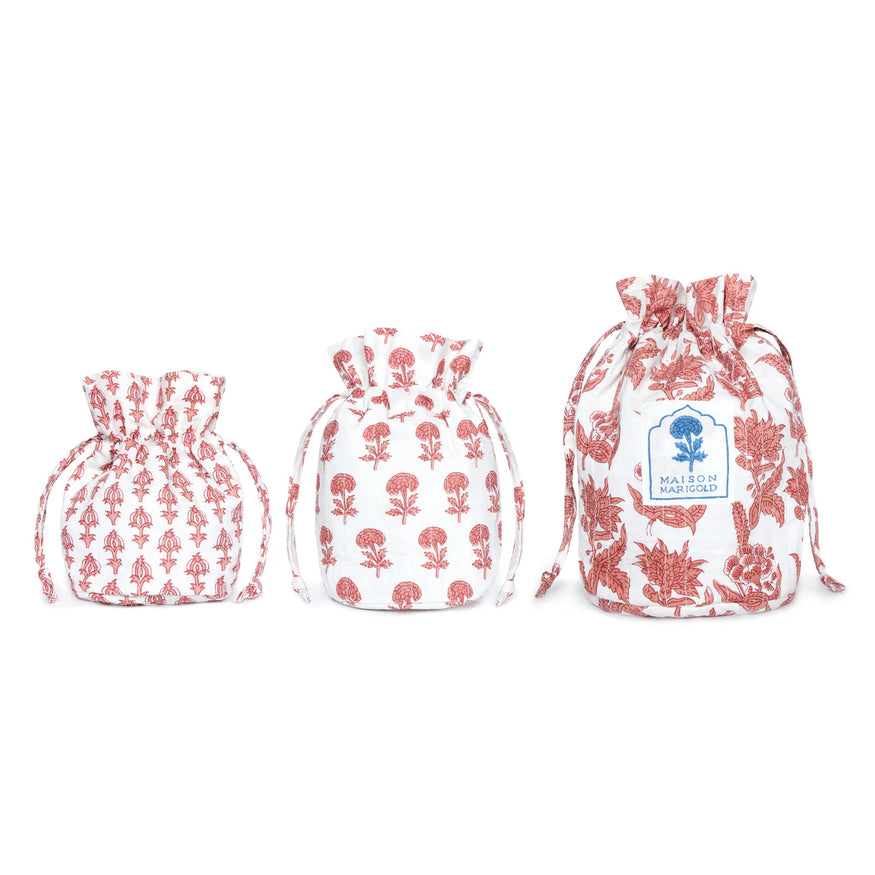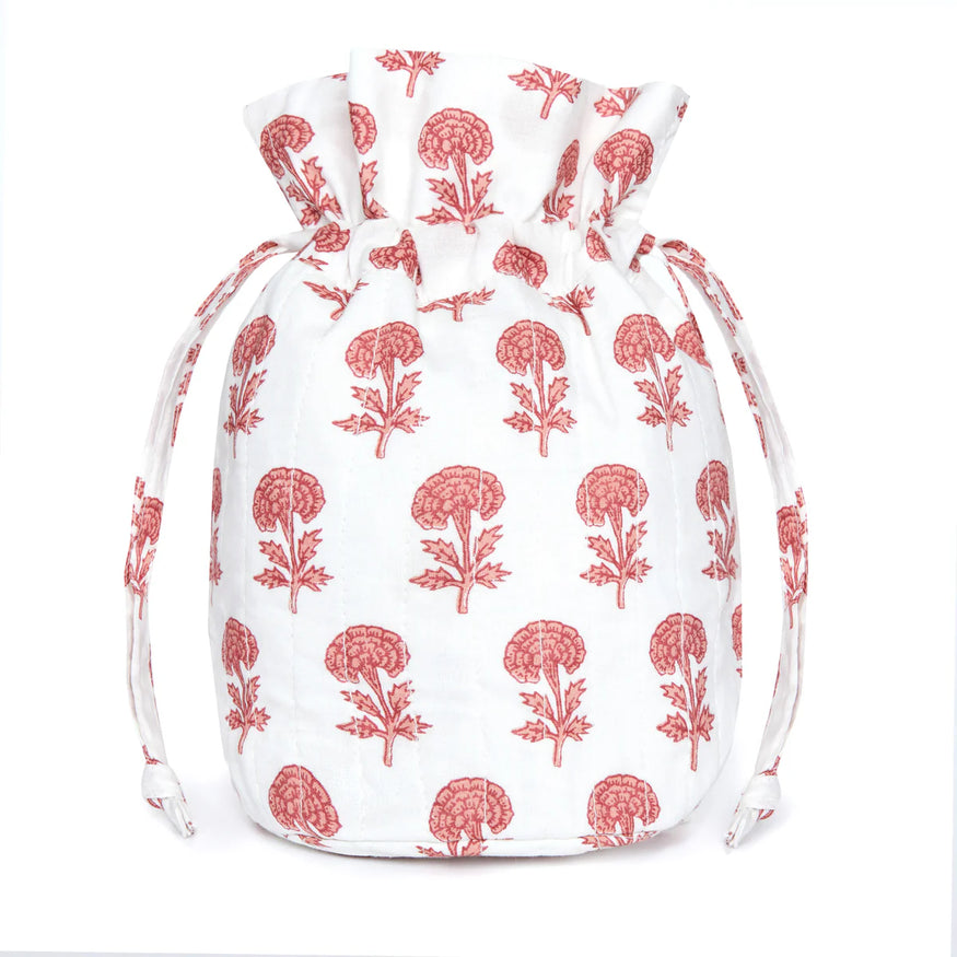 Crafted from quilted cotton cloth in exclusive patterns made with the time-honored tradition of Indian block printing, they can be used to stylishly pack your toiletries or jewelry for your next getaway. The large and medium sizes have internal pockets to protect your items.